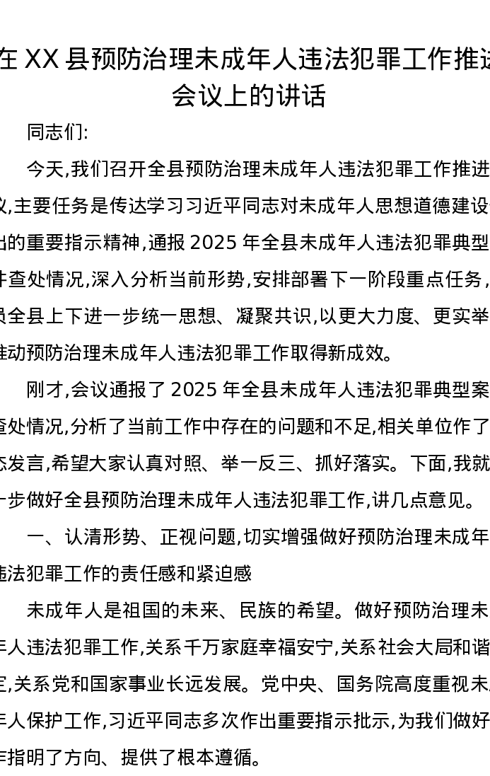 在XX县预防治理未成年人违法犯罪工作推进会议上的讲话