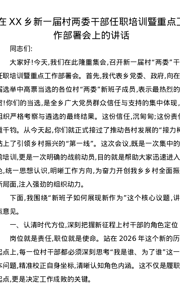 在XX乡新一届村两委干部任职培训暨重点工作部署会上的讲话