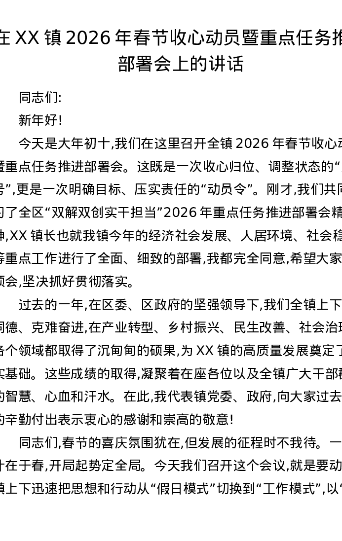 在XX镇2026年春节收心动员暨重点任务推进部署会上的讲话