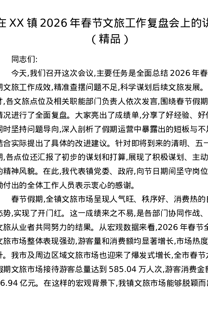 在XX镇2026年春节文旅工作复盘会上的讲话