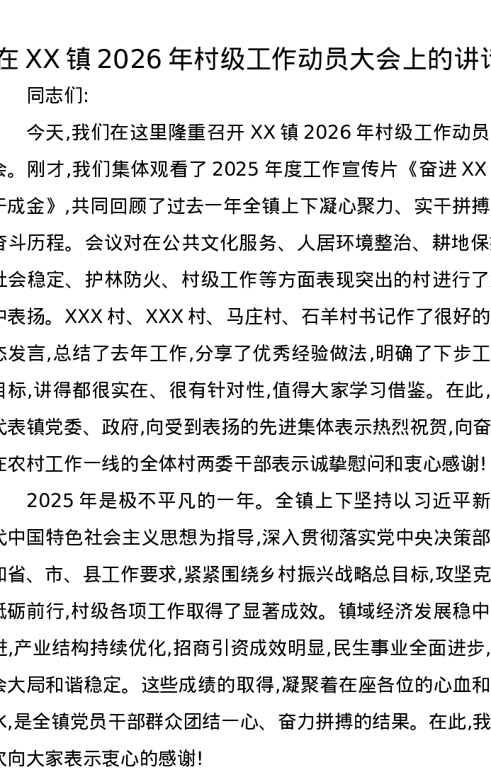 在XX镇2026年村级工作动员大会上的讲话