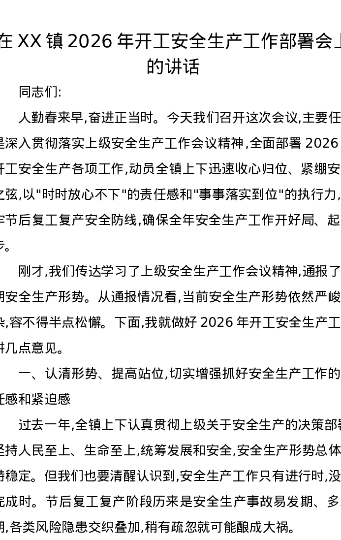 在XX镇2026年开工安全生产工作部署会上的讲话