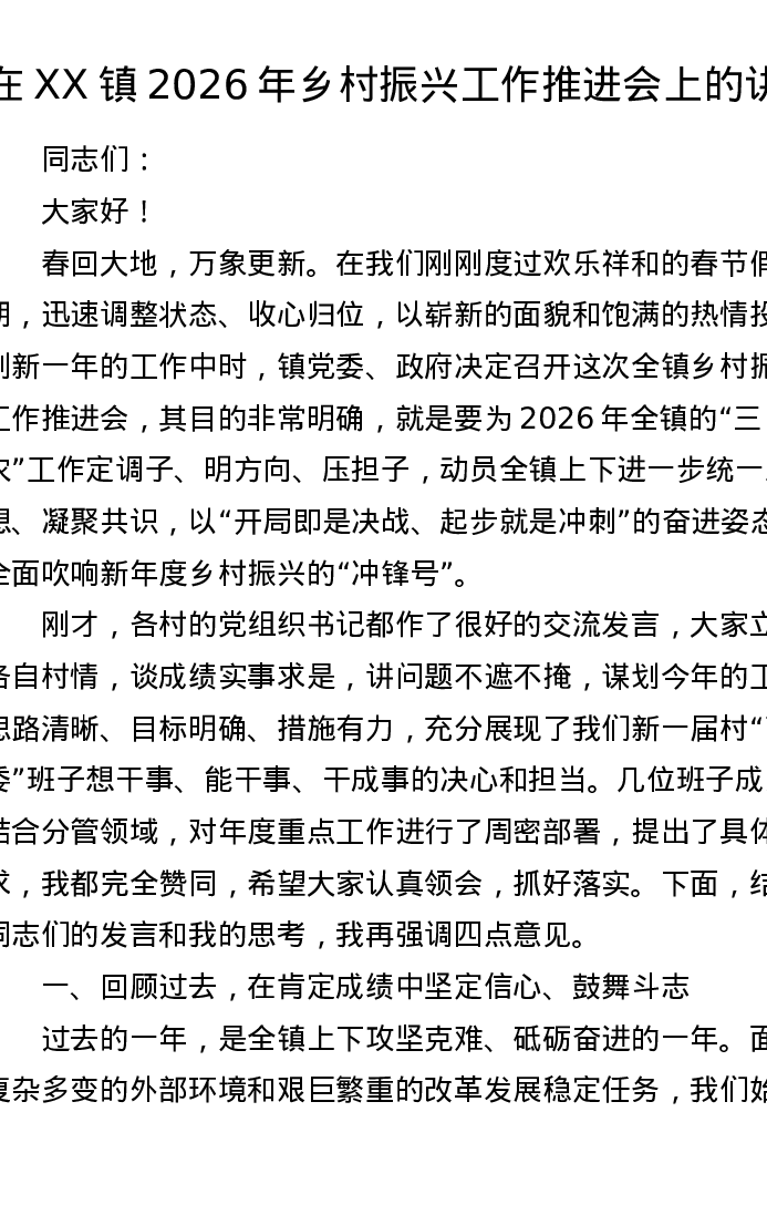 在XX镇2026年乡村振兴工作推进会上的讲话