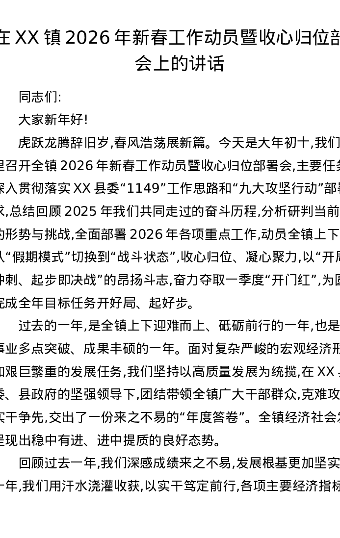 在XX镇2026年新春工作动员暨收心归位部署会上的讲话