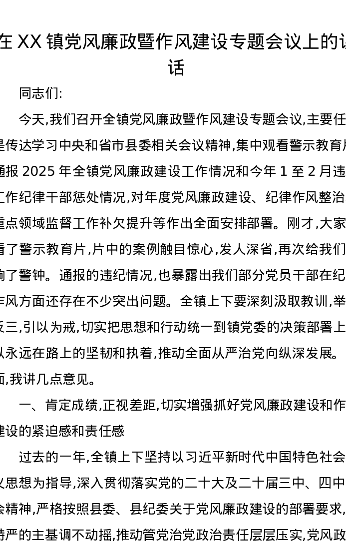 在XX镇党风廉政暨作风建设专题会议上的讲话