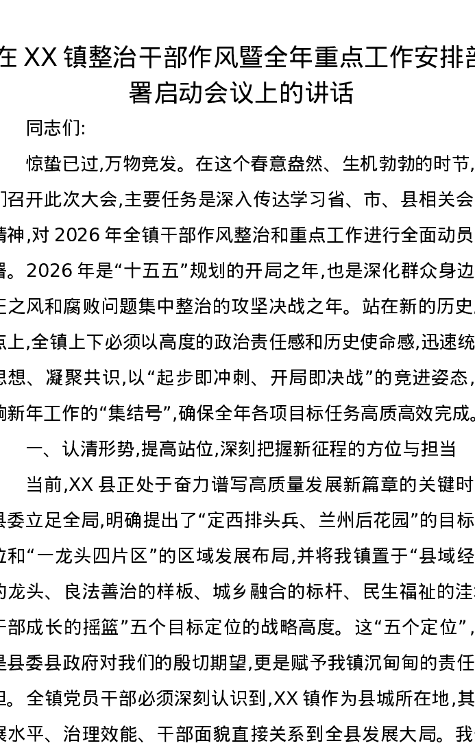 在XX镇整治干部作风暨全年重点工作安排部署启动会议上的讲话