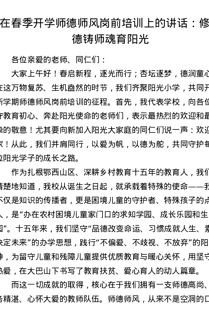 在春季开学师德师风岗前培训上的讲话:修师德铸师魂育阳光