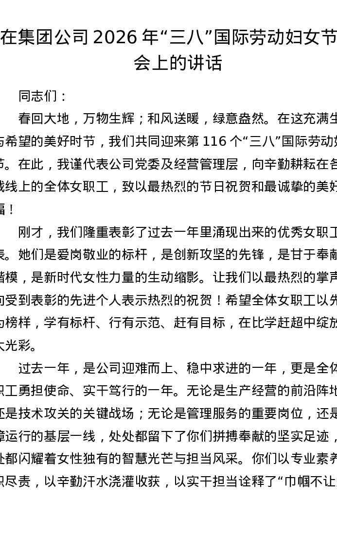 在集团公司2026年三八国际劳动妇女节大会上的讲话