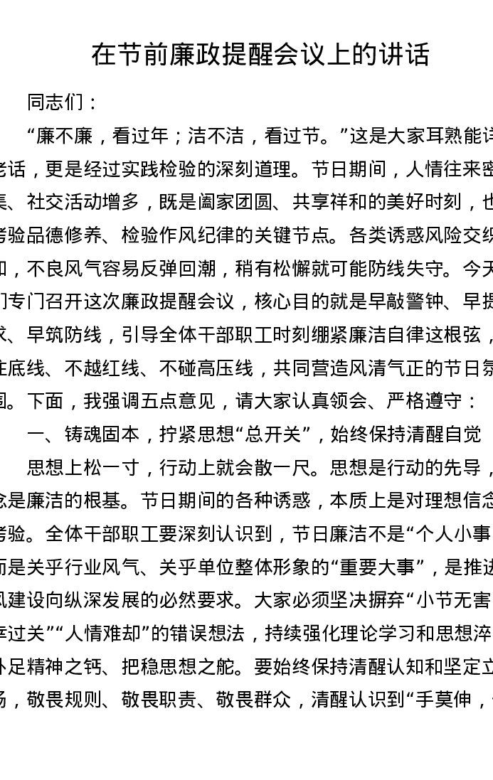 在节前廉政提醒会议上的讲话