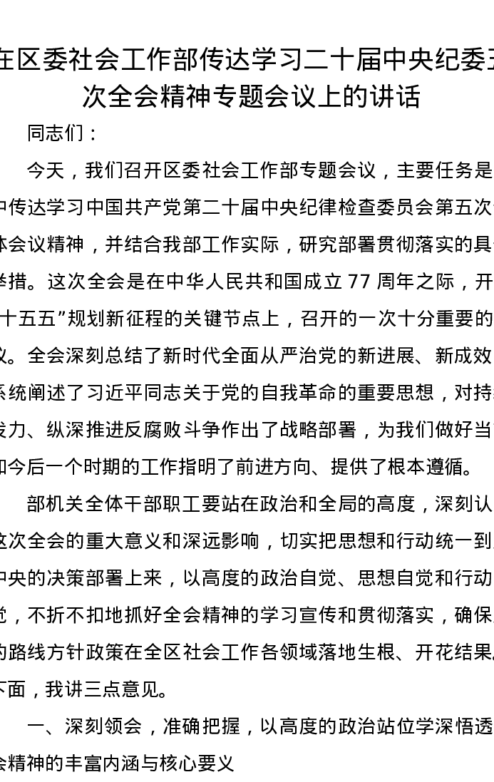 在区委社会工作部传达学习二十届中央纪委五次全会精神专题会议上的讲话
