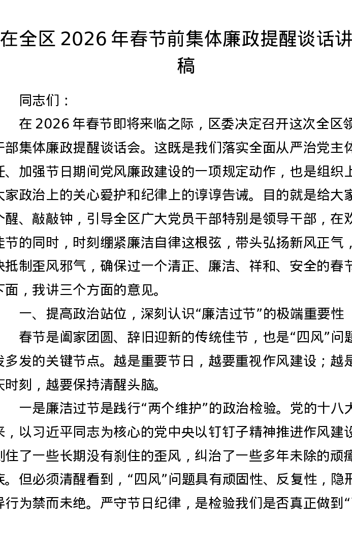 在全区2026年春节前集体廉政提醒谈话讲话稿