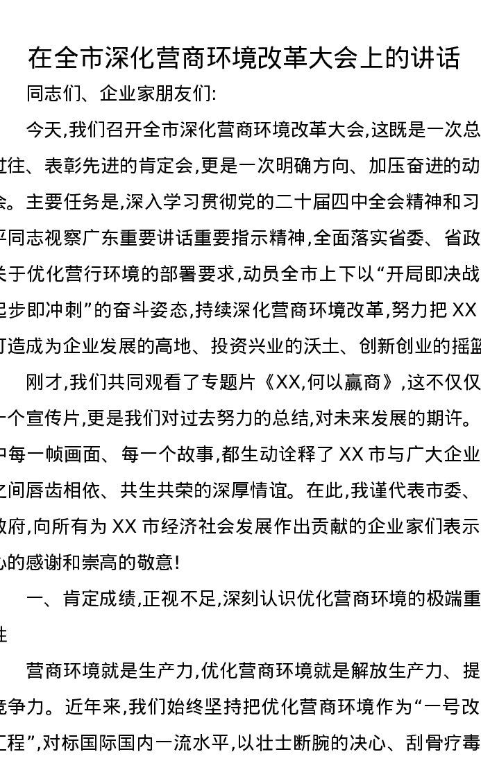 在全市深化营商环境改革大会上的讲话