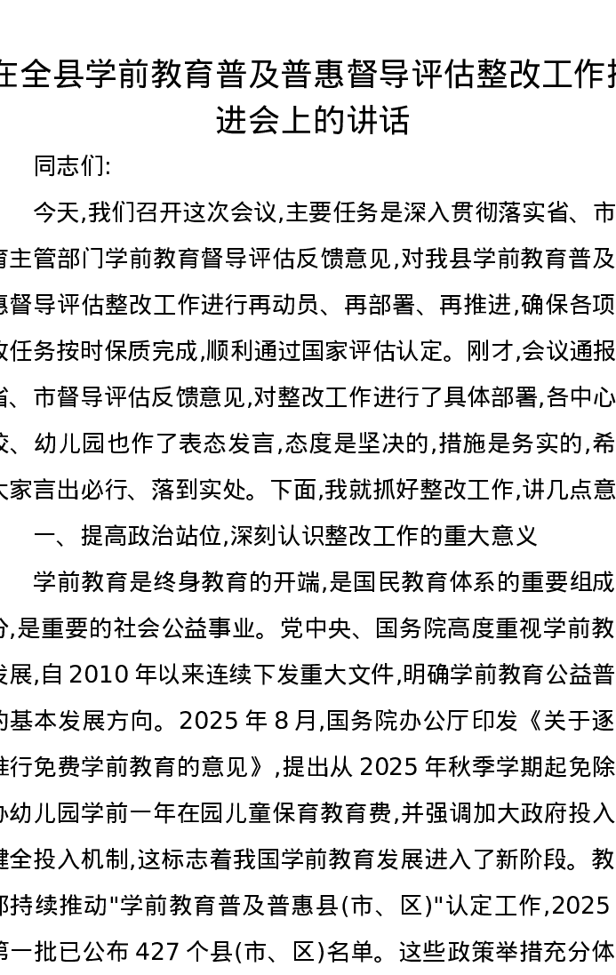 在全县学前教育普及普惠督导评估整改工作推进会上的讲话