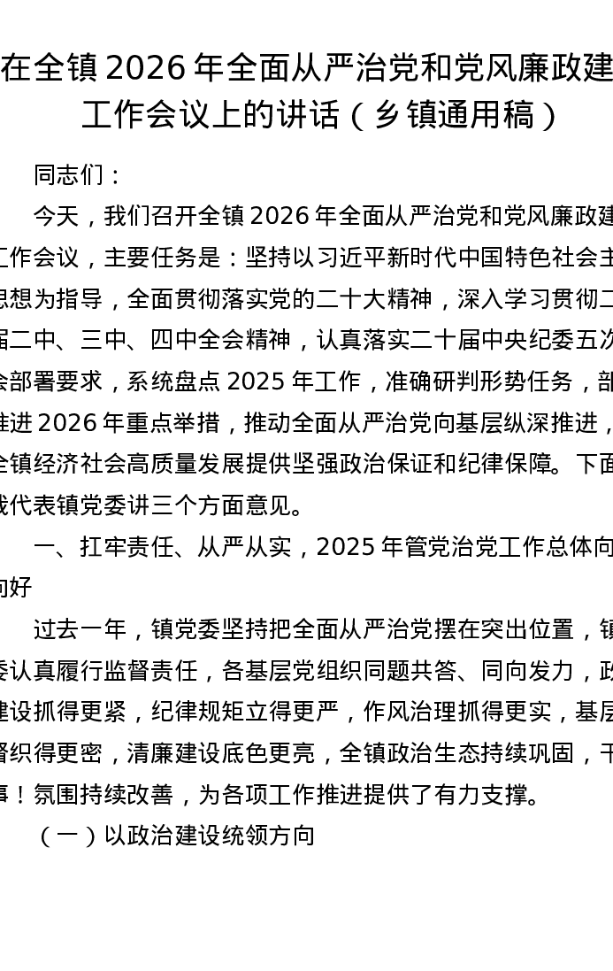 在全镇2026年全面从严治党和党风廉政建设工作会议上的讲话