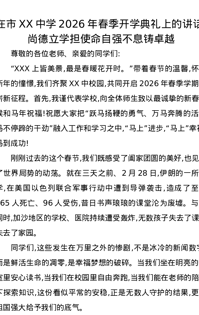 在市XX中学2026年春季开学典礼上的讲话尚德立学担使命自强不息铸卓越