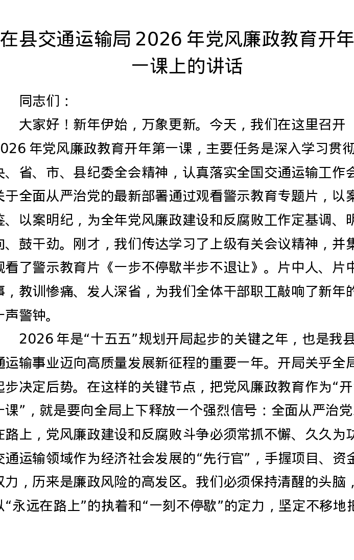 在县交通运输局2026年党风廉政教育开年第一课上的讲话