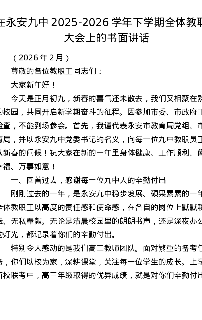 在永安九中2025-2026学年下学期全体教职工大会上的书面讲话