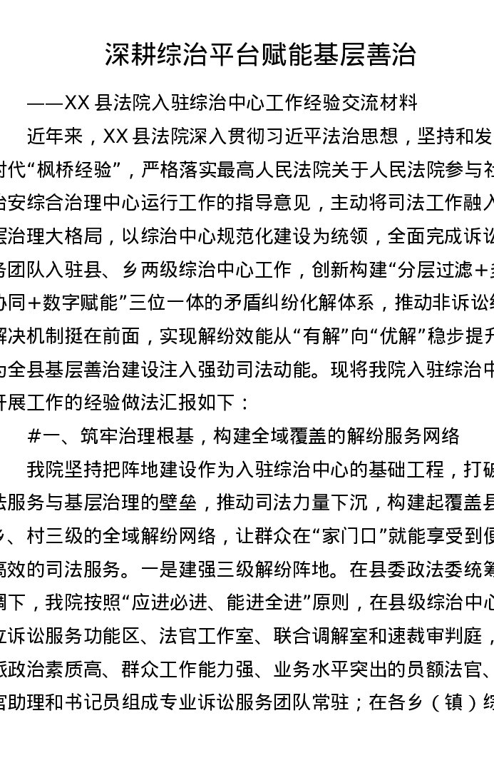 XX县法院入驻综治中心工作经验交流发言材料(3082字)