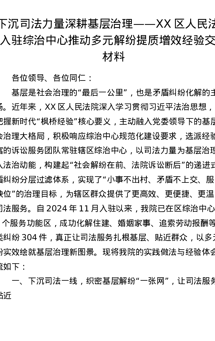 下沉司法力量 深耕基层治理——XX区人民法院入驻综治中心推动多元解纷提质增效经验交流材料