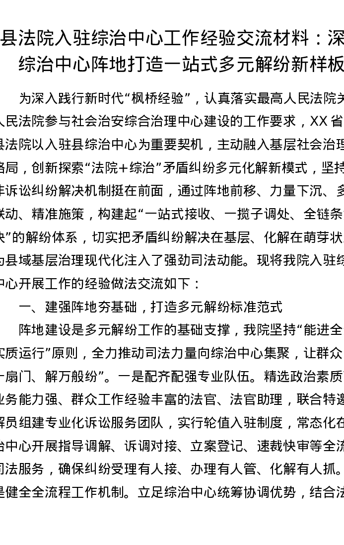 县法院入驻综治中心工作经验交流材料:深耕综治中心阵地 打造一站式多元解纷新样板