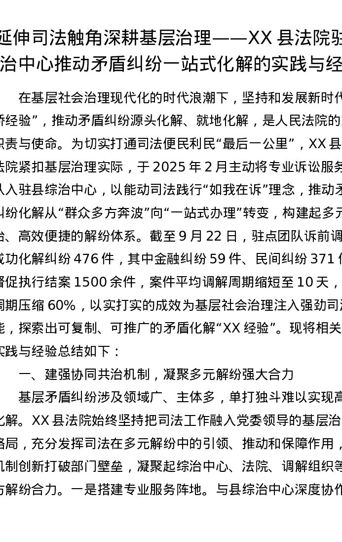 延伸司法触角 深耕基层治理——XX县法院驻综治中心推动矛盾纠纷一站式化解的实践与经验