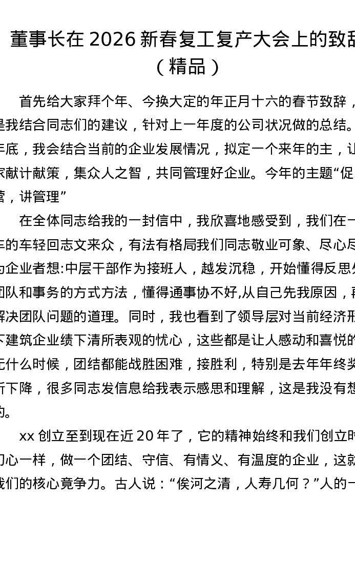 董事长在 2026 新春复工复产大会上的致辞