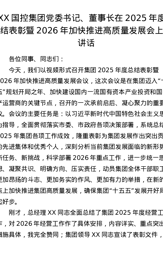 XX国控集团党委书记、董事长在2025年度总结表彰暨2026年加快推进高质量发展会上的讲话