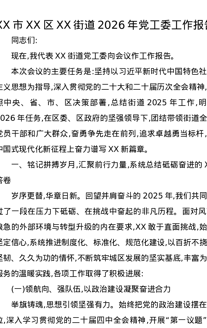 XX市XX区XX街道2026年党工委工作报告