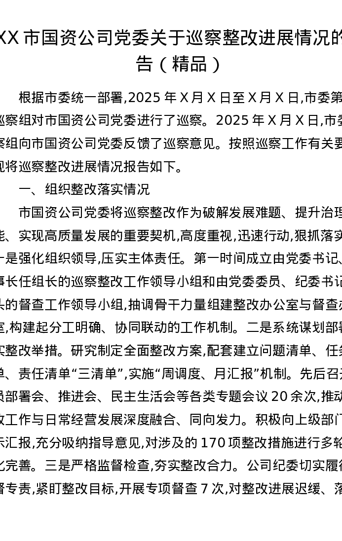XX市国资公司党委关于巡察整改进展情况的报告