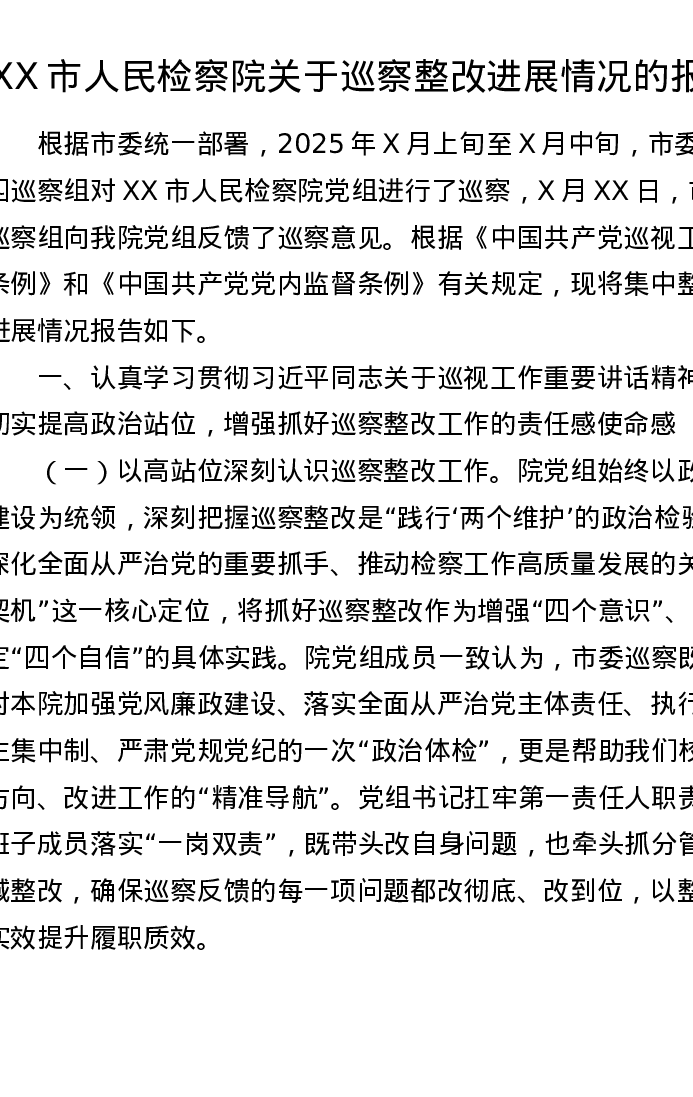 XX市人民检察院关于巡察整改进展情况的报告