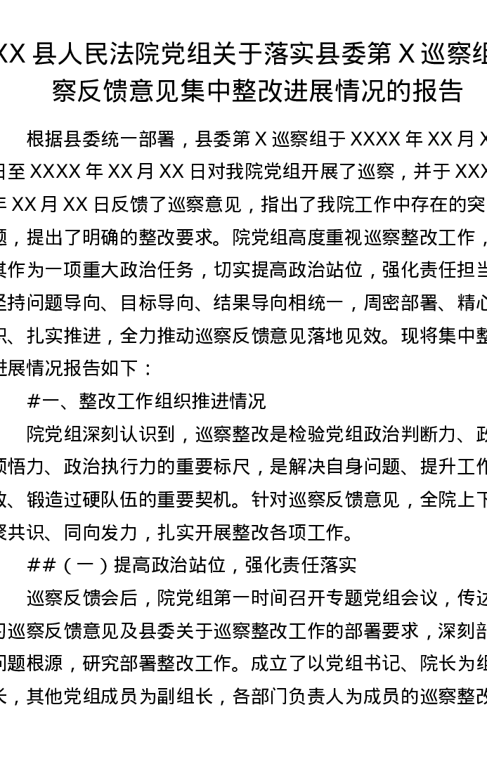 XX县人民法院党组关于落实县委第X巡察组巡察反馈意见集中整改进展情况的报告(5709字)