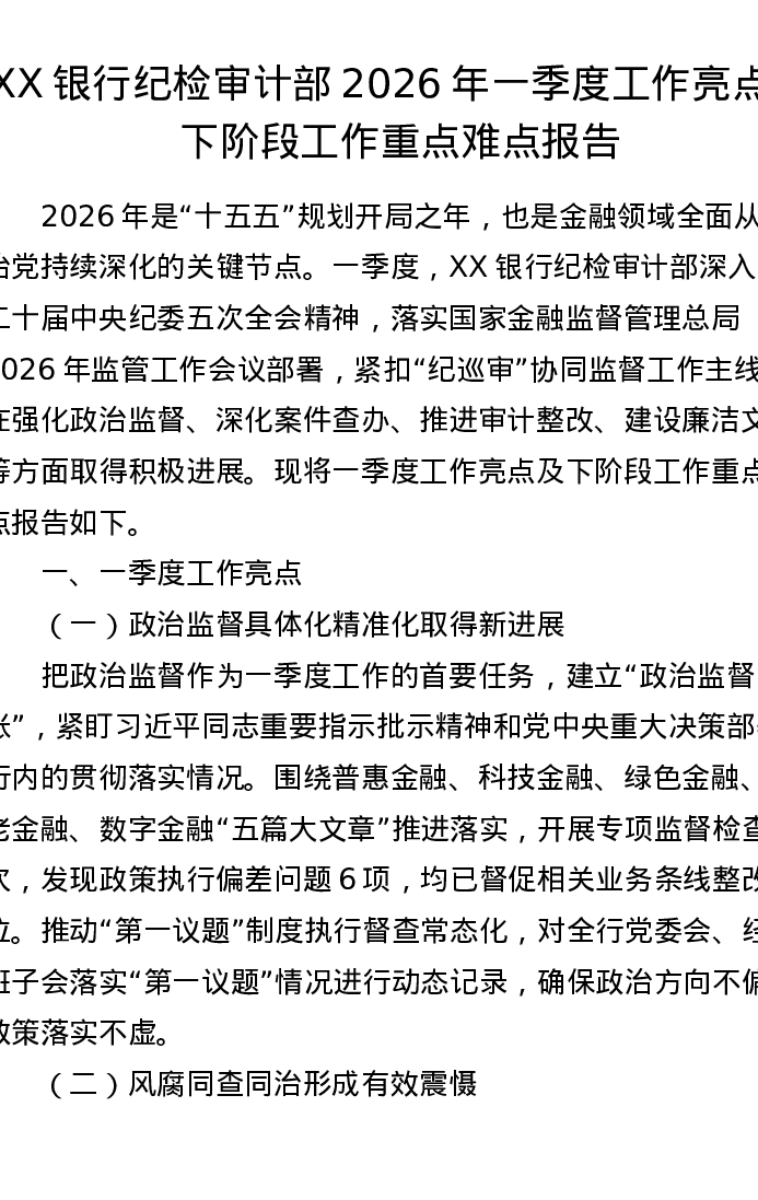 XX银行纪检审计部2026年一季度工作亮点及下阶段工作重点难点报告