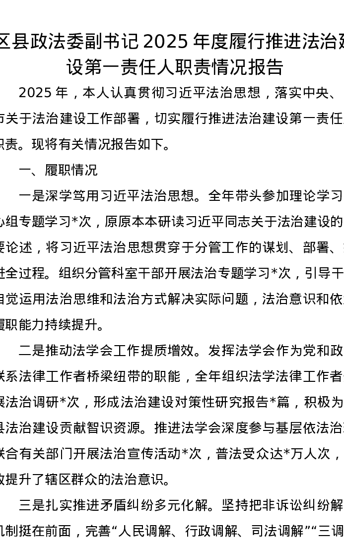 区县政法委副书记2025年度履行推进法治建设第一责任人职责情况报告