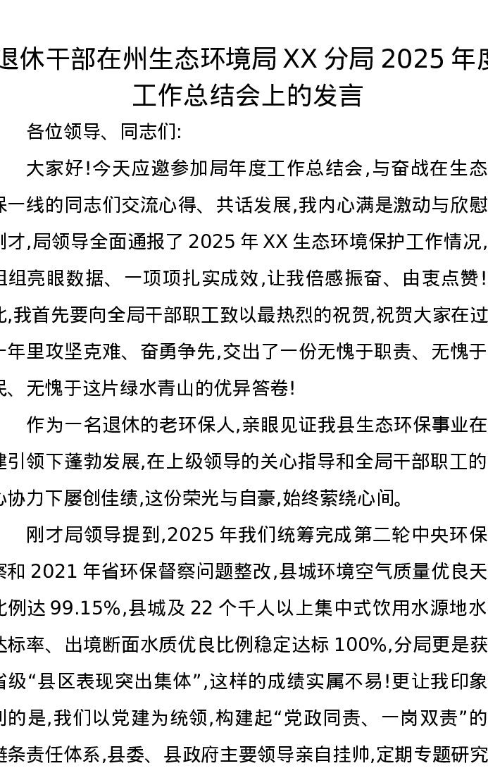 退休干部在州生态环境局XX分局2025年度工作总结会上的发言