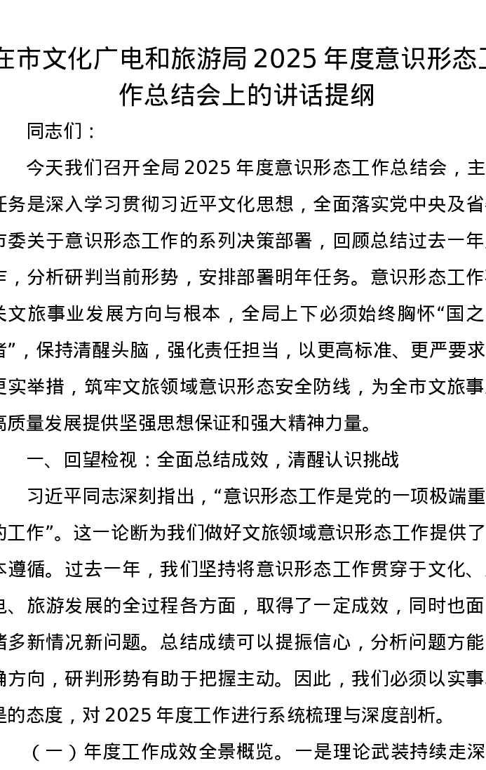 在市文化广电和旅游局2025年度意识形态工作总结会上的讲话提纲