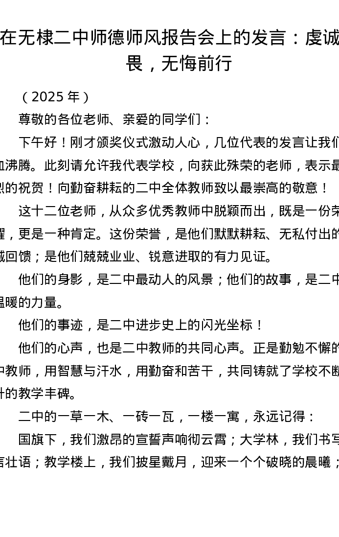 在无棣二中师德师风报告会上的发言:虔诚敬畏,无悔前行