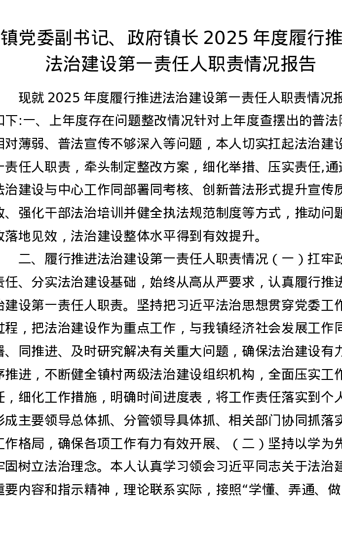 镇党委副书记、政府镇长 2025年度履行推进法治建设第一责任人职责情况报告
