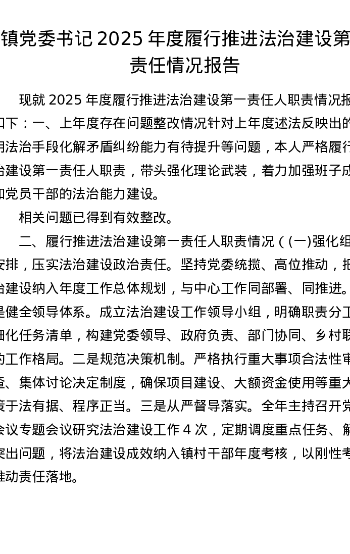 镇党委书记2025年度履行推进法治建设第一责任情况报告