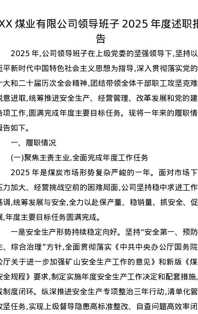 XX煤业有限公司领导班子2025年度述职报告