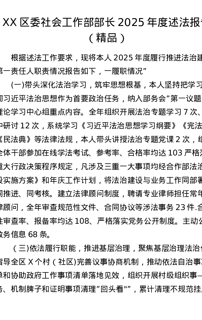 XX区委社会工作部部长 2025年度述法报告