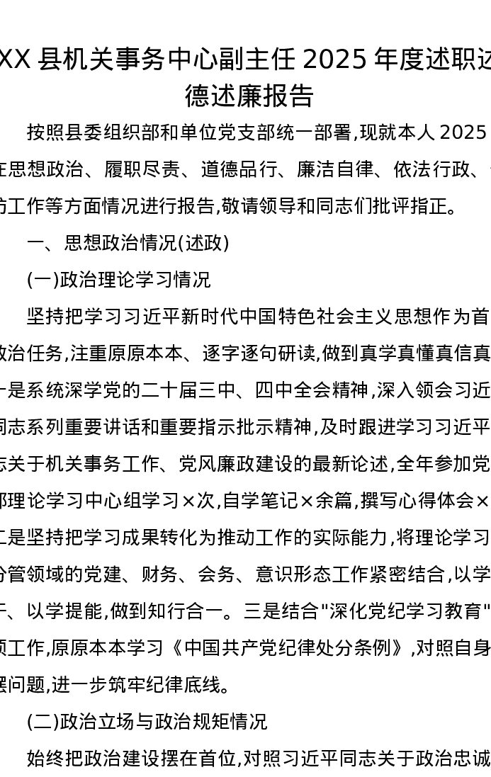 XX县机关事务中心副主任2025年度述职述德述廉报告