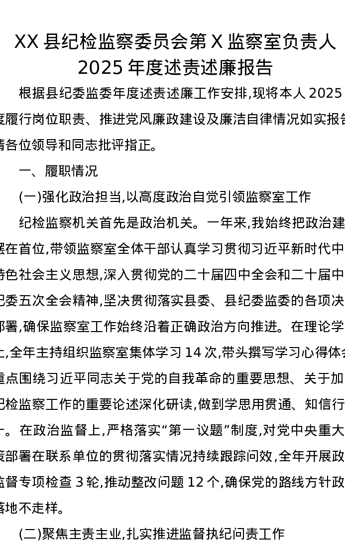 XX县纪检监察委员会第X监察室负责人2025年度述责述廉报告