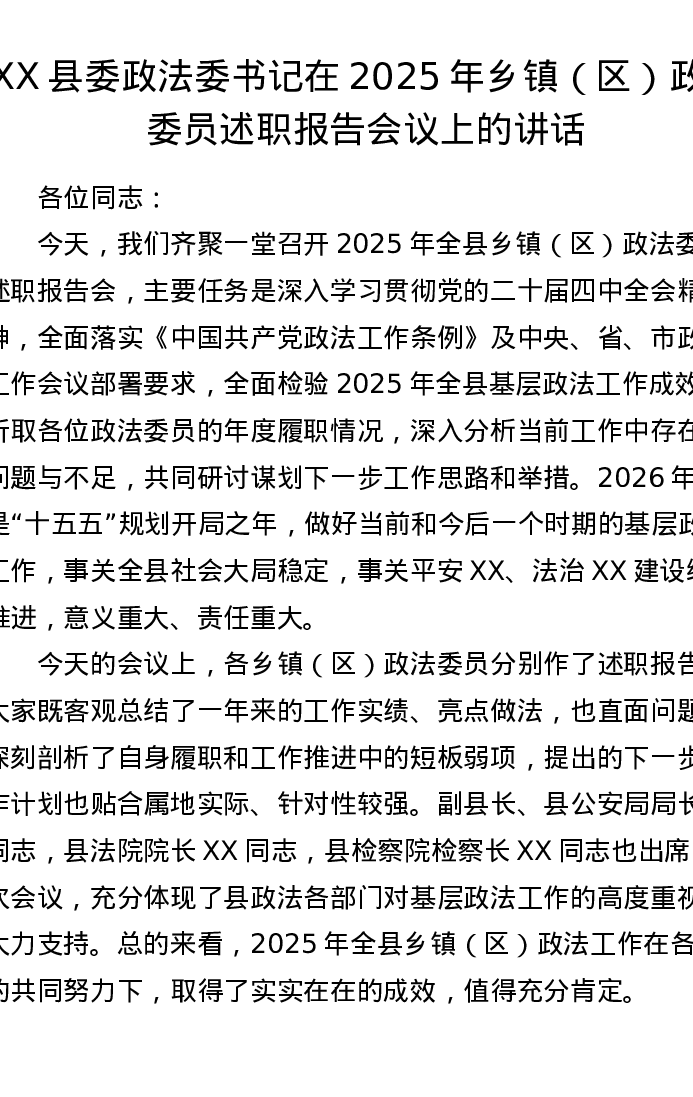 XX县委政法委书记在2025年乡镇(区)政法委员述职报告会议上的讲话(6012字)