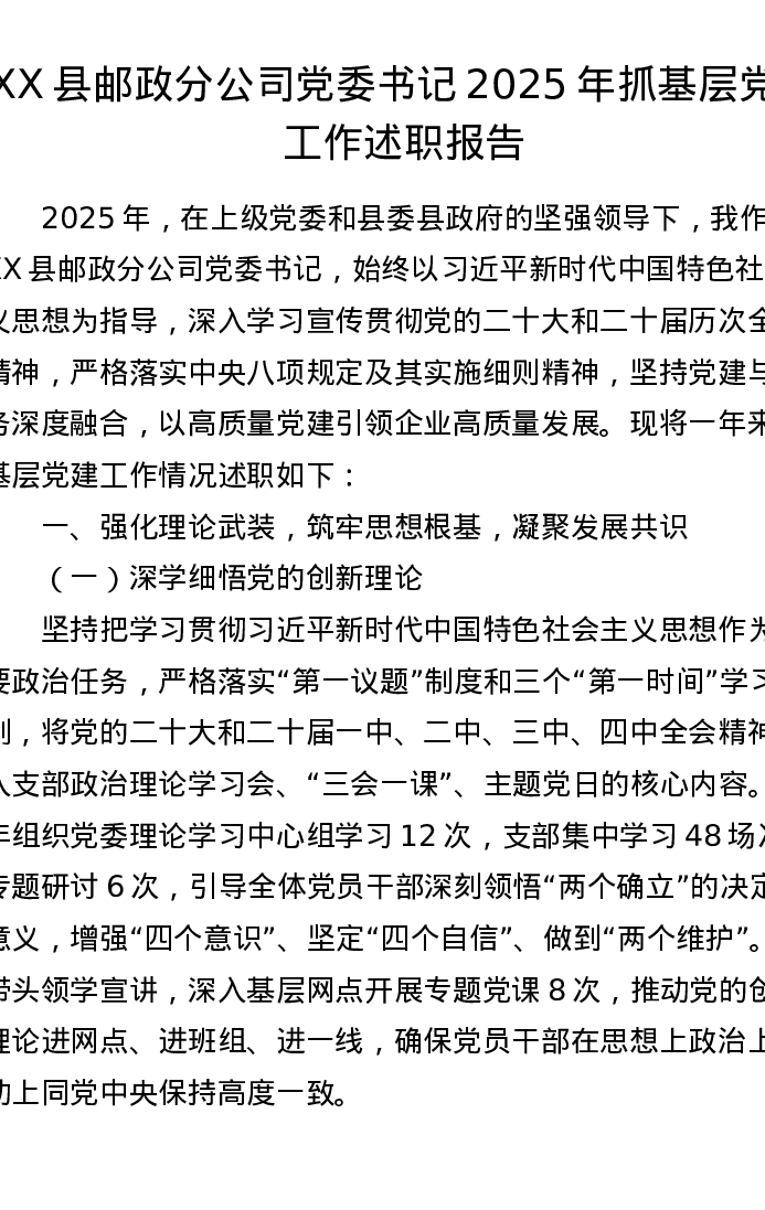XX县邮政分公司党委书记2025年抓基层党建工作述职报告