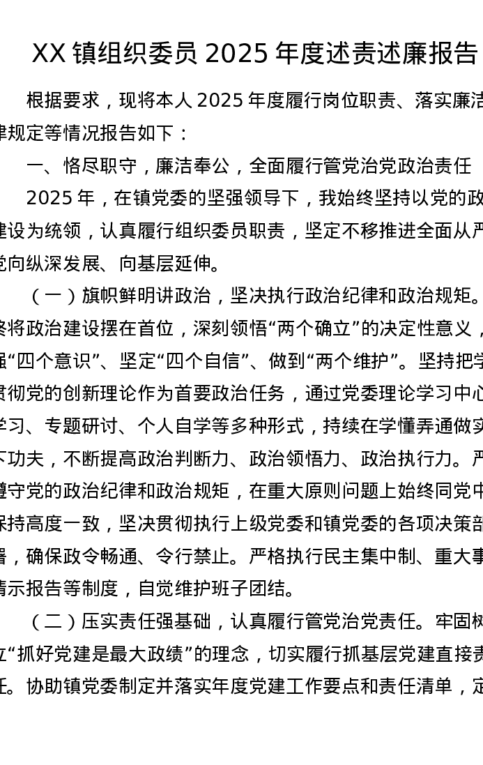 XX镇组织委员2025年度述责述廉报告3