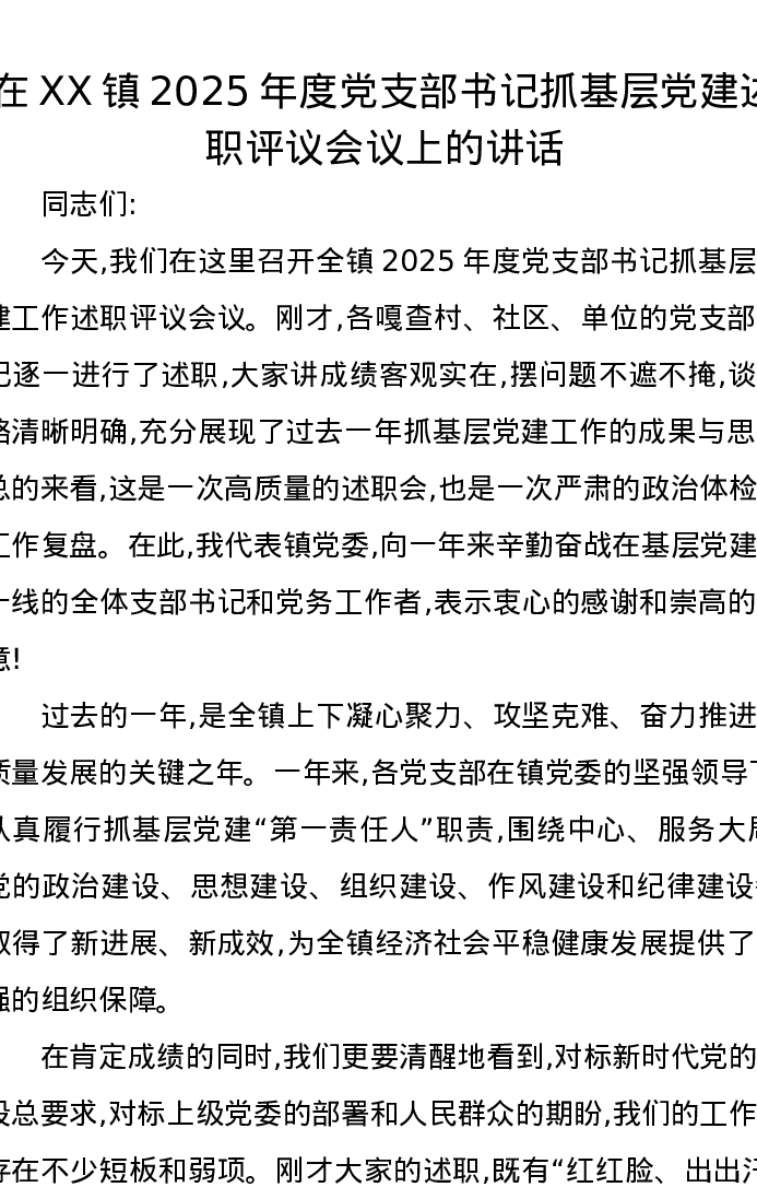 在XX镇2025年度党支部书记抓基层党建述职评议会议上的讲话