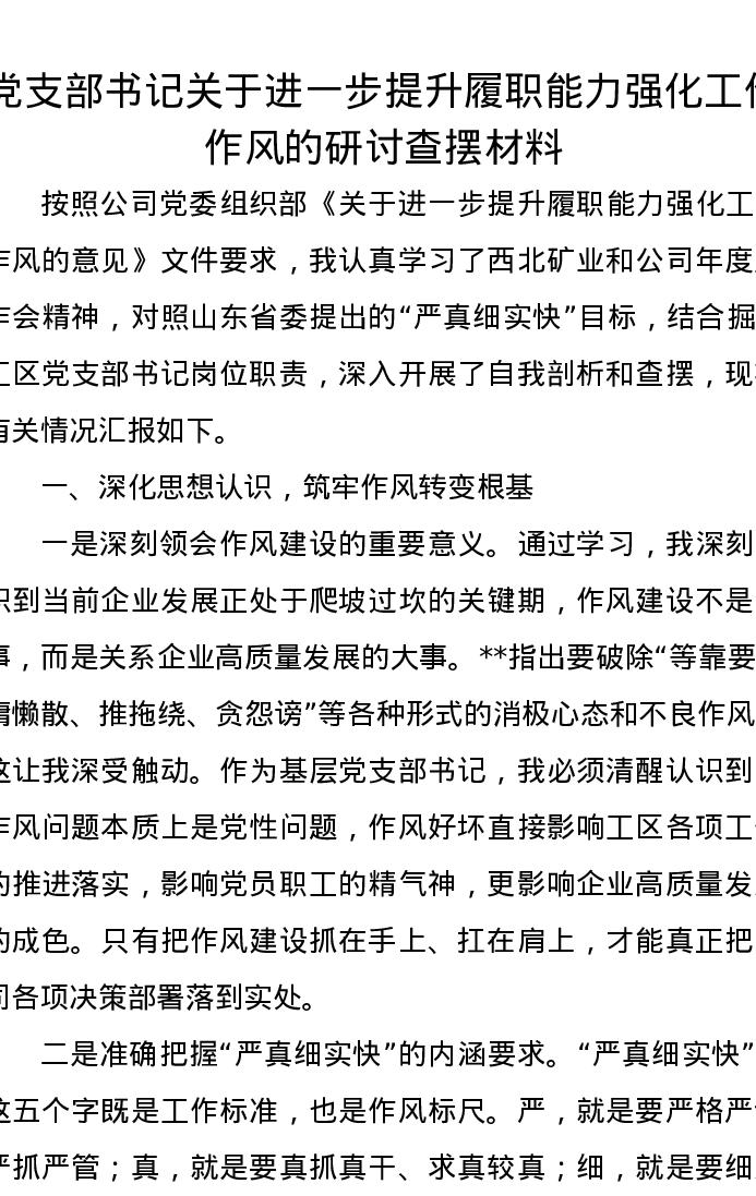 党支部书记关于进一步提升履职能力强化工作作风的研讨查摆材料