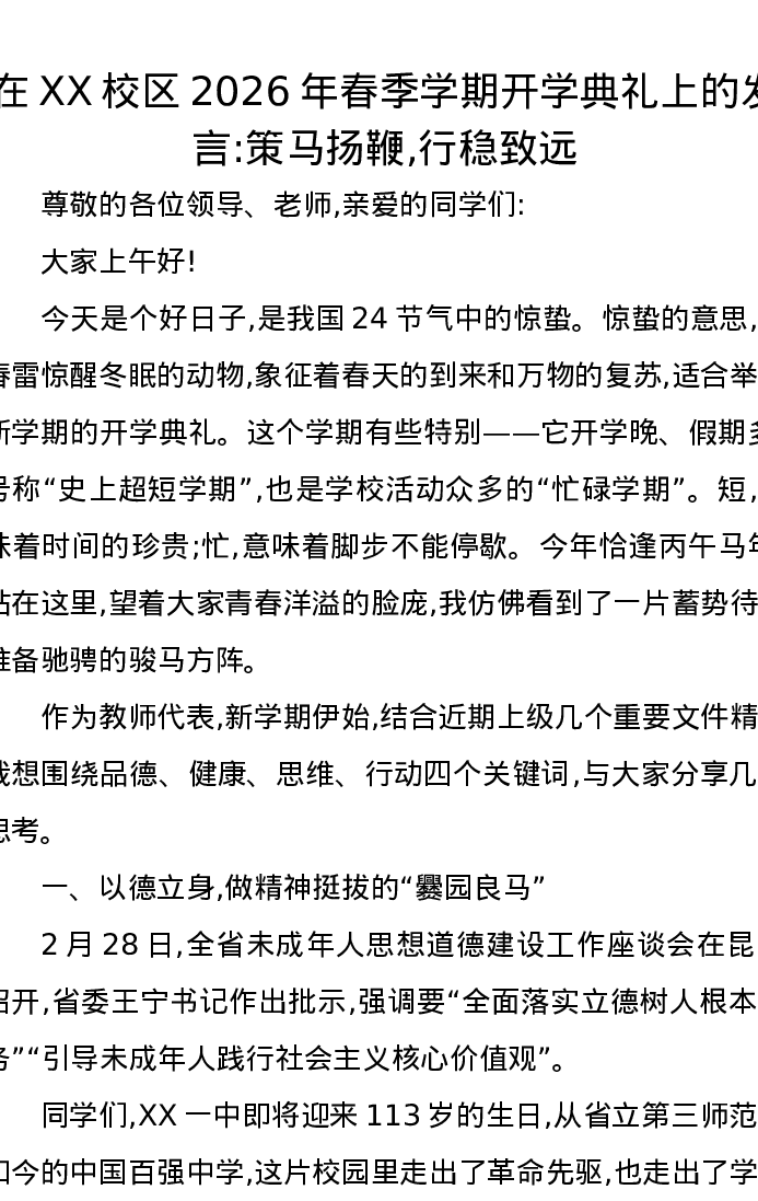 在XX校区2026年春季学期开学典礼上的发言策马扬鞭,行稳致远