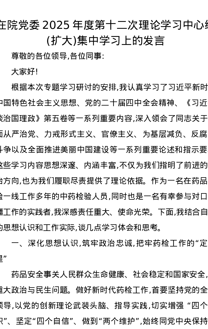 在院党委2025年度第十二次理论学习中心组(扩大)集中学习上的发言