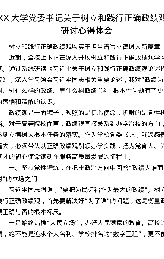 XX大学党委书记关于树立和践行正确政绩观的研讨心得体会